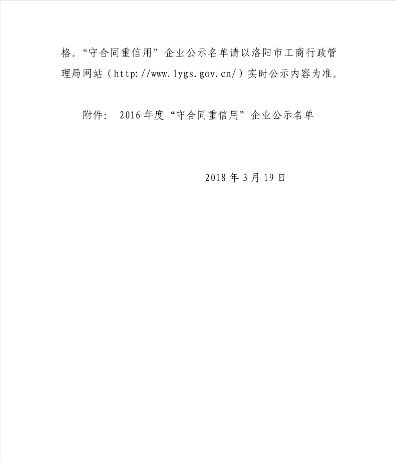近期在洛陽市工商行政管理局公示的“2016年守合同重信用企業(yè)”名單中,我公司名列其中,同時還獲得了省守重企業(yè)稱號。