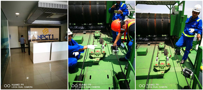 吊裝和工程車輛井然有序的運轉著。我隨著NPCT員工登上幾十米高的岸橋,再來場TST鋼絲繩探傷儀現場操作培訓,不得不佩服印尼兄弟的學習能力,很快就熟練掌握鋼絲繩探傷設備的操作技術。哈哈,請允許我小得意番,我們泰斯的設備是很容上手的嘛。